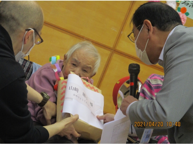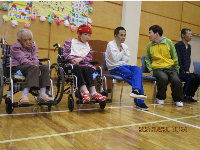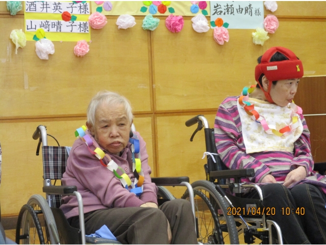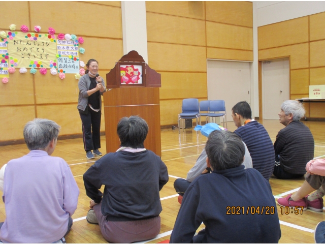 4/20(火)午前中に4月生まれの方の誕生日会を行いました。1階、2階の利用者が皆で集まって皆でお祝いしました。最後に紙芝居を皆で見ました。愛厚半田の里 生活支援員