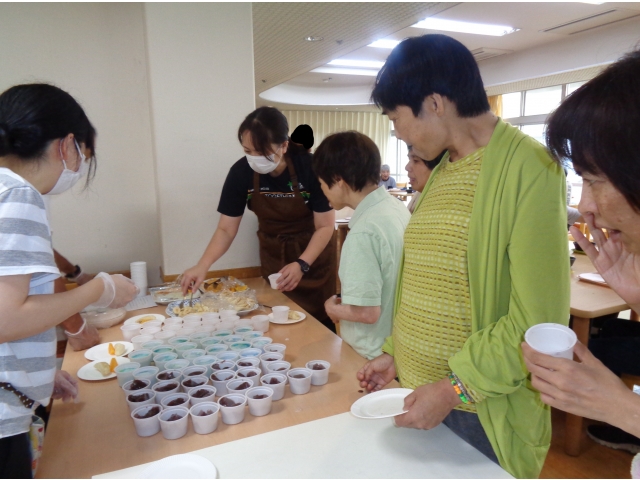 七夕会当日の昼食はバイキング食でした。ロールケーキ、オレンジ、バナナ、水ようかん、七夕ゼリー、フルーチェ…普段とちょっと違うメニューが提供され、利用者様は大喜びでした。午後は紙芝居や本の読み聞かせを行いました。