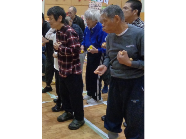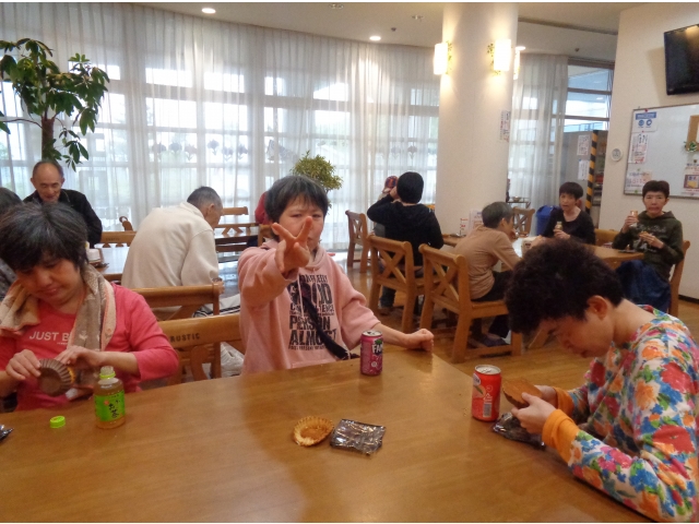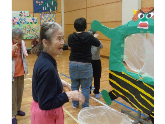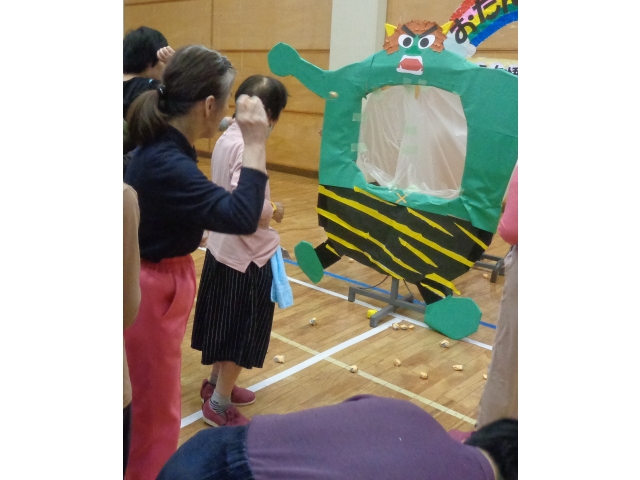 本日はゴールデンウィークということで、つばき町では男女に分かれて玉入れ大会を実施しました。皆様、熱中して的の鬼に玉を投げ入れていました。また玉入れの後には自販機で購入した飲み物と一緒にお菓子を頂きました。