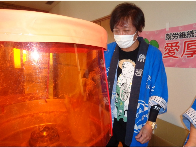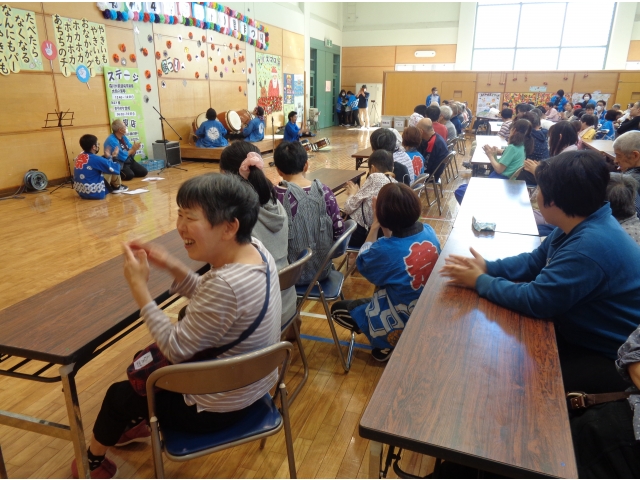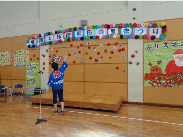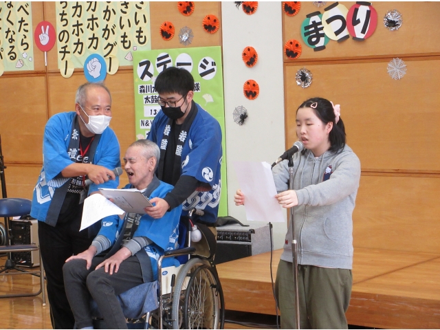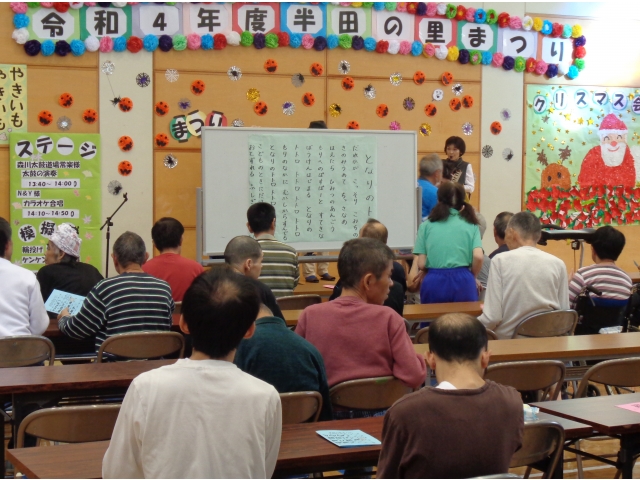 その後半田の里まつり開幕。今年は模擬店(けんけんぱ・輪投げ・折り紙の飾り作り・綿菓子)を行ったほか、ステージイベントのゲストボランティアとして、森川太鼓道場常楽様による和太鼓演奏とN&Y様によるカラオケおよび伴奏を行っていただきました。ステージ中は利用者様・職員からの手拍子・拍手が巻き起こり大いに盛り上がりました。また普段あまり表情の変化が見られない利用者様からも笑顔や手拍子が見られていました。ご出演頂きありがとうございました!今回の良い点や反省点を次回の里まつりに生かし、皆様に楽しんで頂けるようこれからも頑張っていきます!