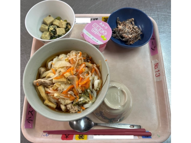 メニューは、けんちんうどん、凍豆腐の卵とじ、こんにゃくの白和え、桃ゼリーです。