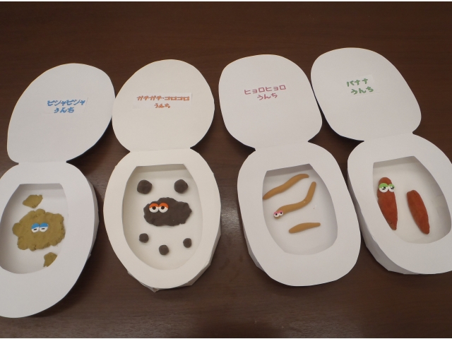 ひもを使って9mの長さの小腸を再現したり、手作りのトイレを開いて様々な形状のうんちを覗いたりしました😁