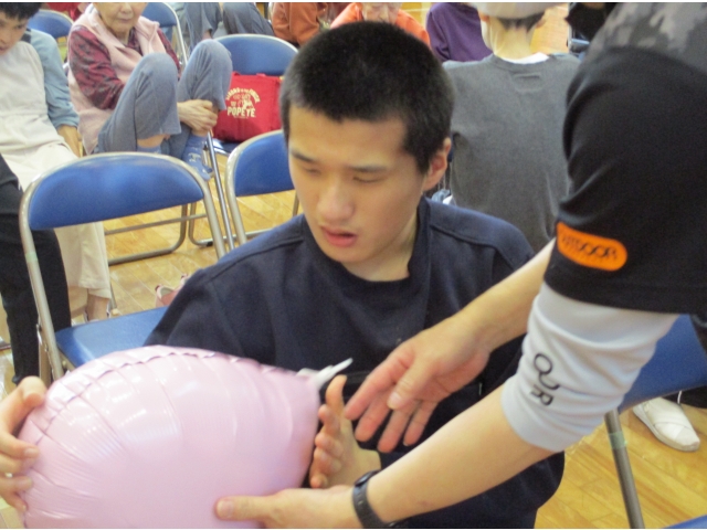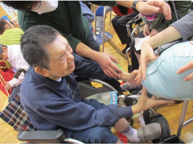 今月のレクリエーションは「風船送りリレー」2月に合わせた3色のハート型の風船たちを、利用者様同士で協力して送りあいました。全員が体を使ったレクリエーションは久々だったこともあり、今回のレクリエーションも皆さん楽しんでいただけた様子でした。