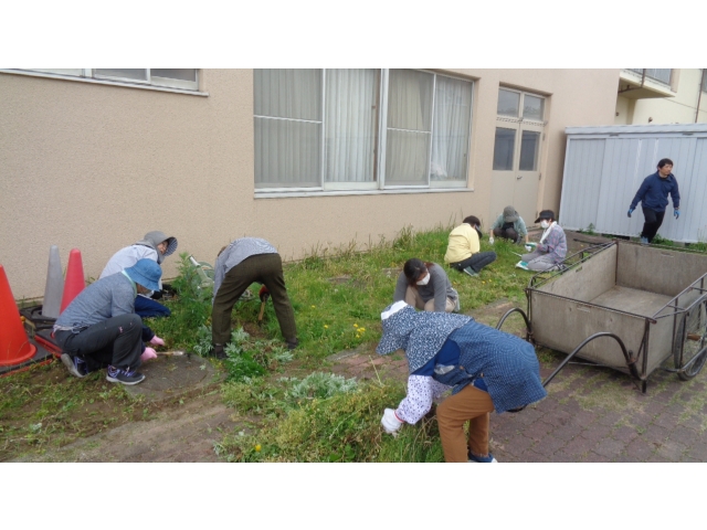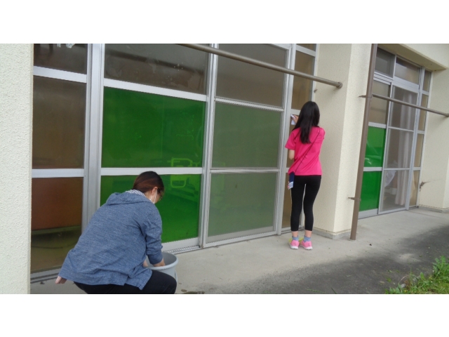 今年度も天理教の方々が、清掃ボランティア(ひのきしん)を行ってくださいました。当日は雨が心配な天候でしたが、活動中は雨に降られることはなく、グラウンドや南面の草刈り、居室外の窓拭きを行っていただきました。