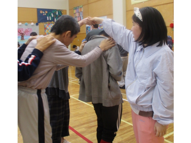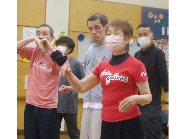 活動中は手や足などの全身を使って時間いっぱい体を動かしました。特に真ん中の写真は一列に並んで前の人の肩を持ち、音楽に合わせて電車のように体を動かすもので、利用者の中でも特に反響の大きいものとなりました。中には職員の真似をして、トンネルのアーチをつくる方もいたりと、みんな一体となって楽しく参加することができました。