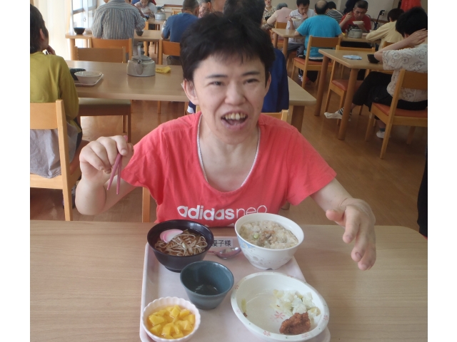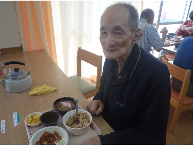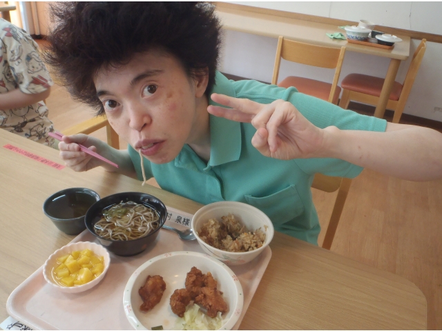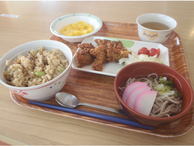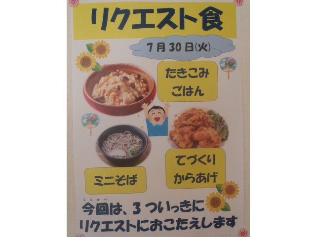 半田の里では、毎月利用者様から食べたいものを募り、リクエスト食として提供しています。8月は 手作り唐揚げ・炊き込みごはん・ミニそばと、3ついっきにリクエストにお応えします!