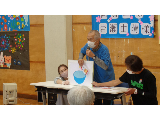今年度も誕生日会を実施することとなり、まずは4月の方の誕生日会を実施しました。新しい次長さんよりプレゼントを手渡され、皆喜ばれておりました。レクリエーションは紙芝居を実施し、皆さん楽しんで聞いておられました。