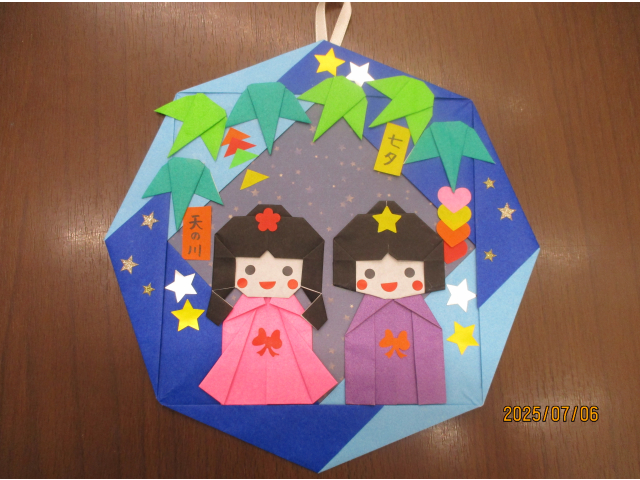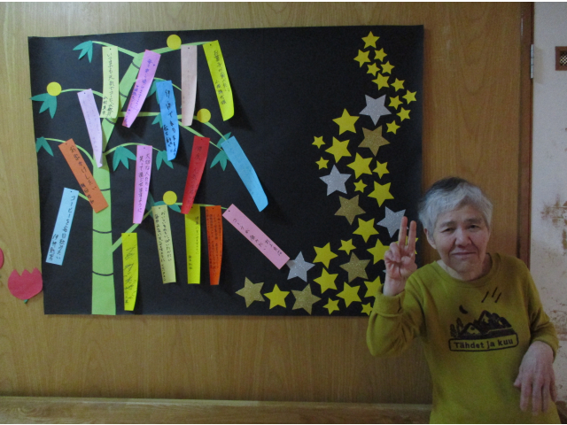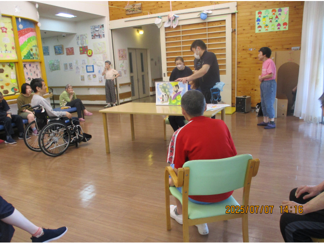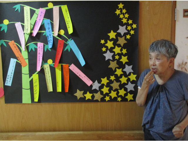利用者皆さんの願いのかいあり、当日晴天のもと、七夕会を行う事が出来ました。 創作が得意な職員が作成された飾りを彩りに添え、今年も七夕にちなんだ紙芝居を行いました。最後はみんなで記念撮影を行いました。