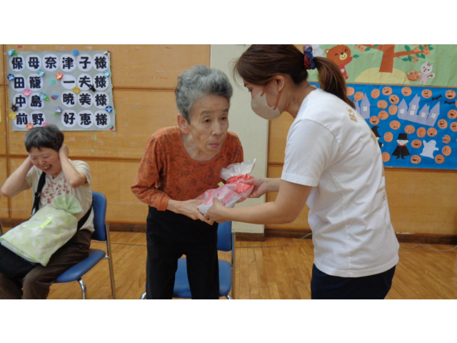 8月にお誕生日を迎える利用者様をお祝いしました。希望品を渡されると袋の中をのぞいたり笑顔を見せたりなど、皆様嬉しそうなご様子でした。レクリエーションでは職員がオカリナを演奏し、曲に関するクイズを出して利用者様に答えていただきました。知っている曲が流れると一緒に歌ったりクイズに答えるため手を挙げたりと楽しそうに参加されていました。