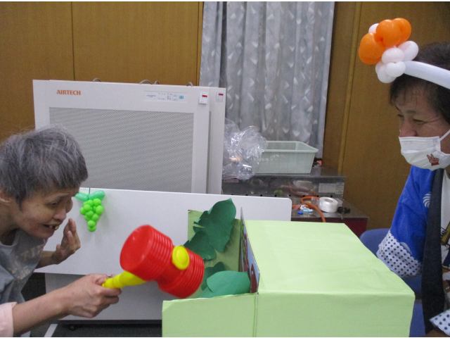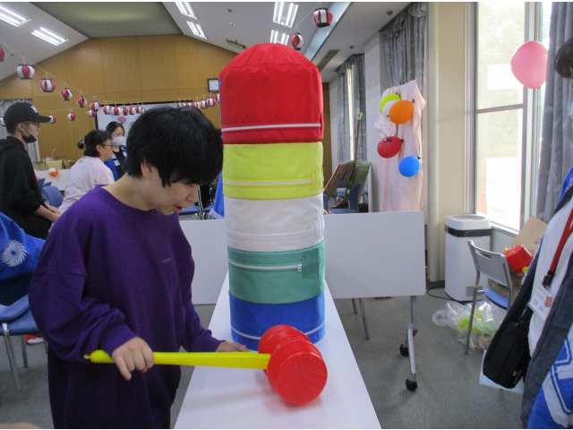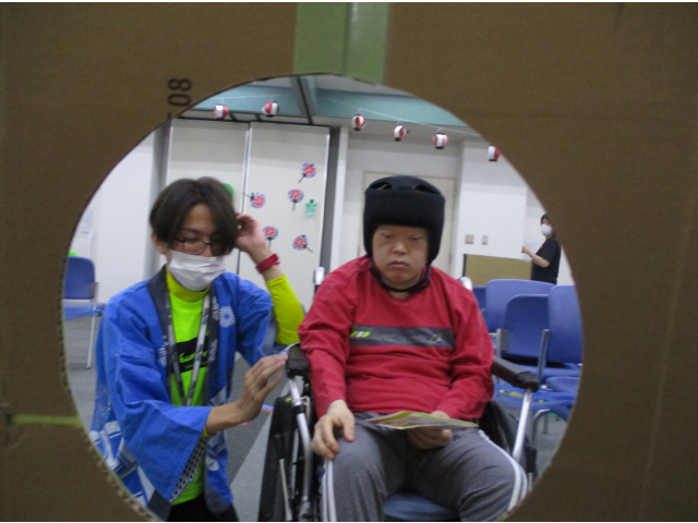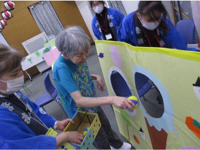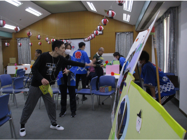 模擬店では「ワニワニパニック」「的あて」「だるまおとし」を行い、利用者様同士で応援しあったり笑いあったりしてそれぞれの模擬店を楽しまれていました。