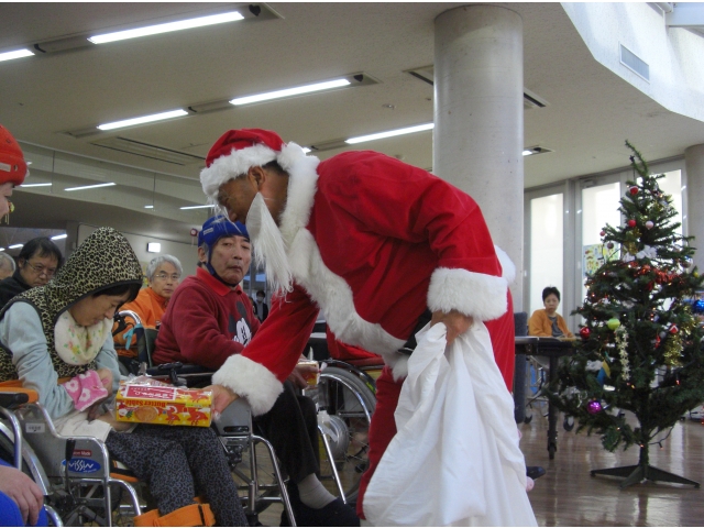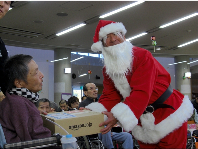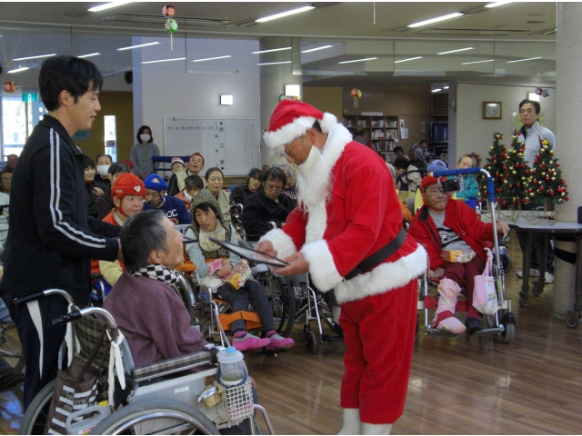 クリスマスソングが流れる中、サンタさんが利用者ひとり一人にプレゼントを手渡ししていただきました。