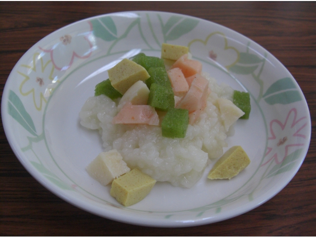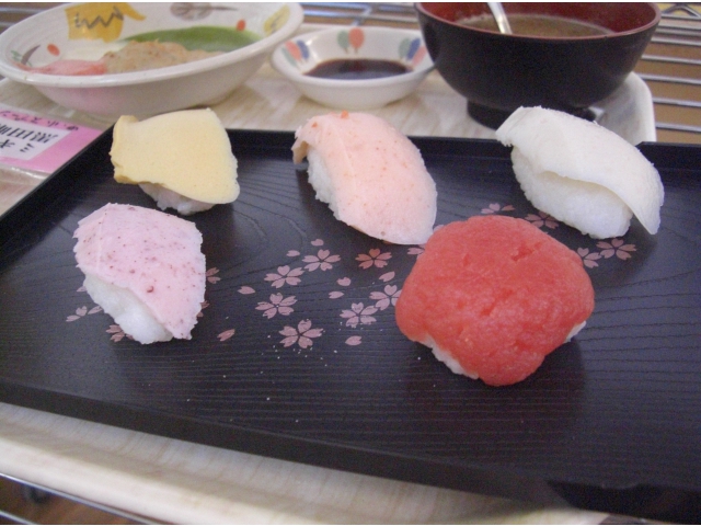 クリスマス会の食事として、普段ミキサー食を食べている人たちにも普通食に負けないお寿司を味わっていただこうと、施設で調理したソフト食のお寿司を提供しました。