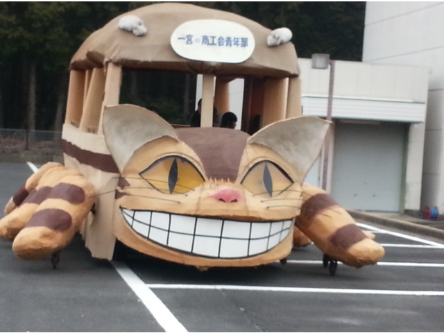 少し暖かくなった平成26年3月1日(土)、一宮生涯学習会館で行われた『ジャンプ祭り』に、ねこのバスがやってきました。全部、一宮商工会議所青年部さんの手作りです。とてもよくできていますね。