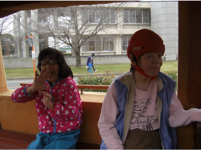 仲良しの利用者様二人はお気に入りの赤いTシャツを着て、写真撮影をしました。