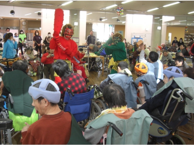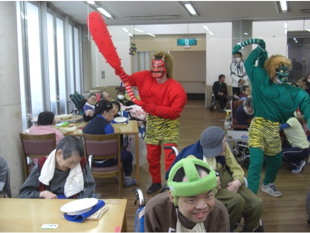 そのあとは、おまちかね?の鬼の登場です。鬼たちはこん棒を振り回しながら暴れまわります。利用者の皆様は鬼に向かって、必死に豆を投げつけ、「おには~そと!ふくは~うち!」と大声をあげて豆まきを行いました。いつもは穏やかな利用者様も、このときばかりは鬼に向かって必死に豆を投げつけてみえました。皆様のおかげで協力して鬼を追い払うことができました。