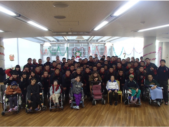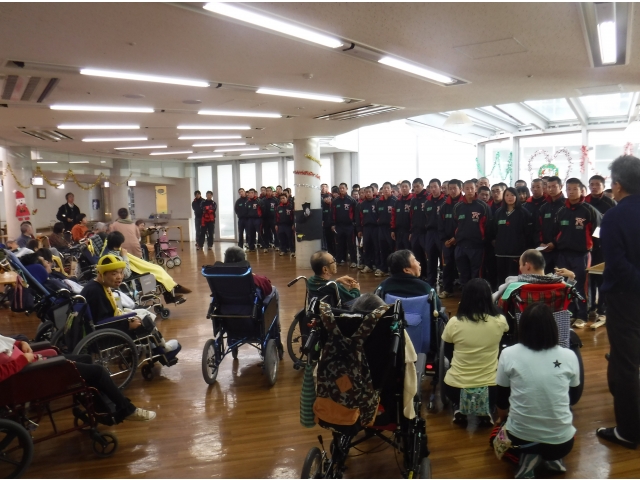 平成28年12月10日(土)「豊川高等学校野球部」の部員69名の皆さまがボランティア活動にみえました。 施設の敷地内の落ち葉清掃と、利用者様と「ボッチャ」というボールを使ったゲームを楽しみました。