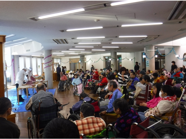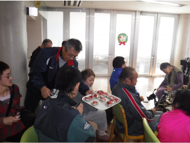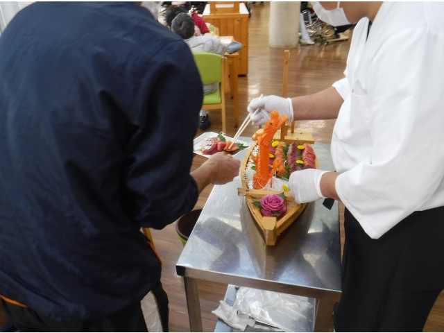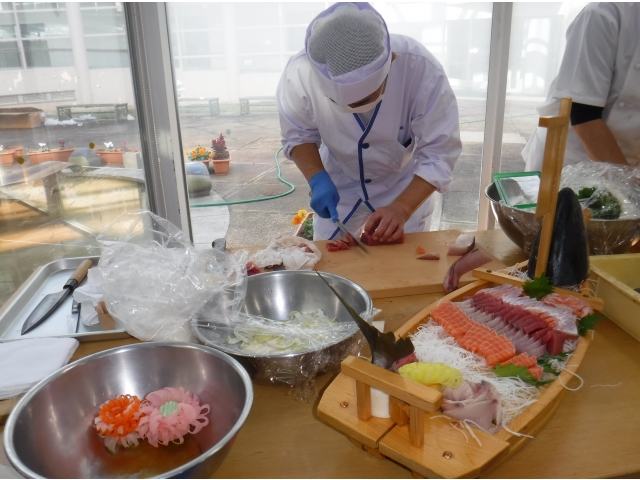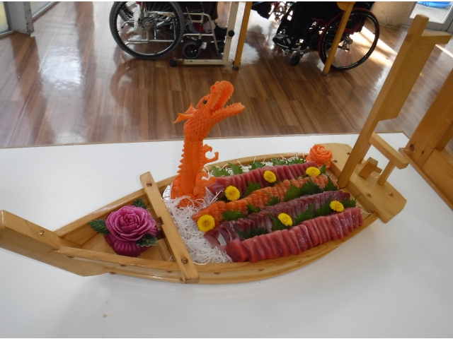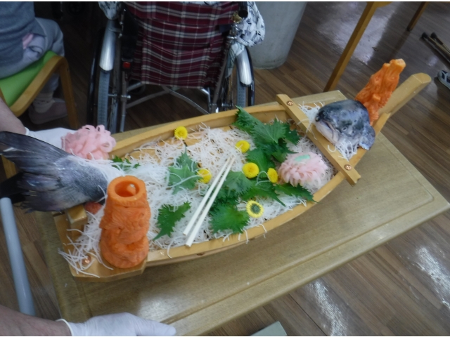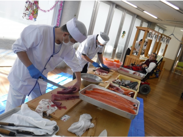 解体ショーでさばいたマグロは昼食で利用者様に提供され、新鮮なマグロの刺身に「おいしー」と言われていました。