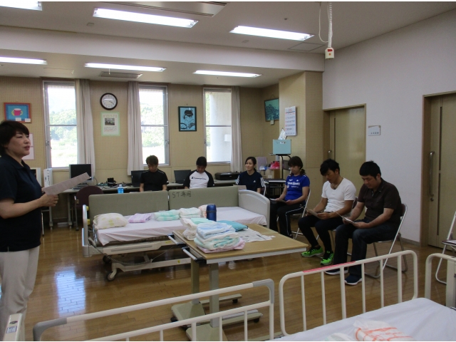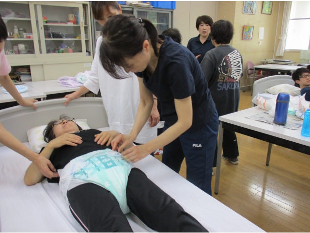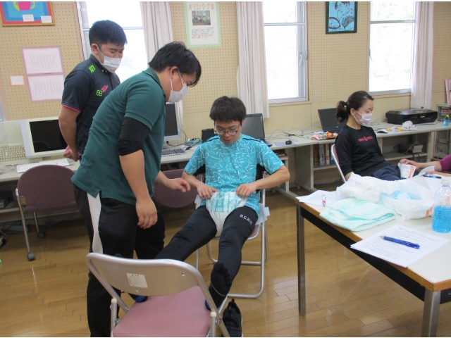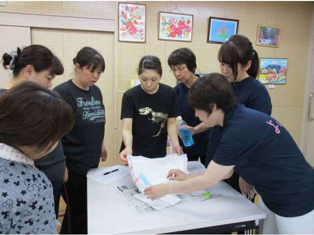 講義では、実際にオムツ・パッドを職員同士で現場で行っているようにあててみて、講師より適切な方法でのあて方を学び、再度、あててみることで感じる違いを知ることができました。