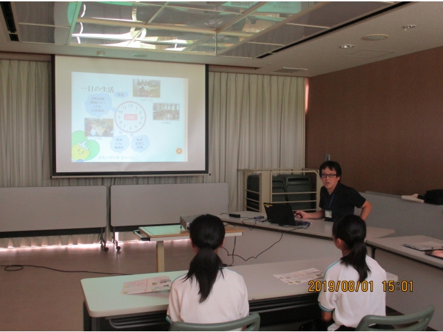 1日目の後半は、パワーポイントを使って、「介護のしごと~入所者の生活サポート~」を説明させていただき、“介護の魅力”を知っていただくために、実際にヨーグルトを使って、食事介助の体験を行いました。