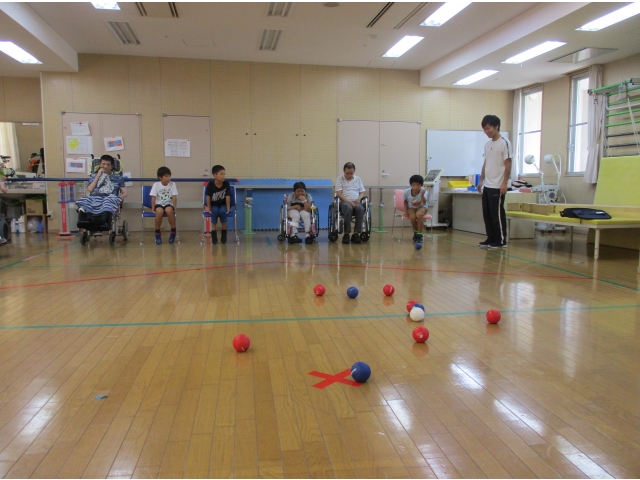 利用者の皆さんの投球補助では、“ランプ”という補助具を支えて差し上げたり、投球方向の調整補助を行っていただきました。参加者の皆さん、利用者の皆さんが投球しやすいように援助を行うことの難しさを感じることができたかと思います。