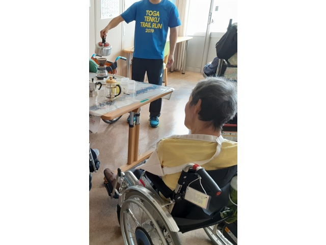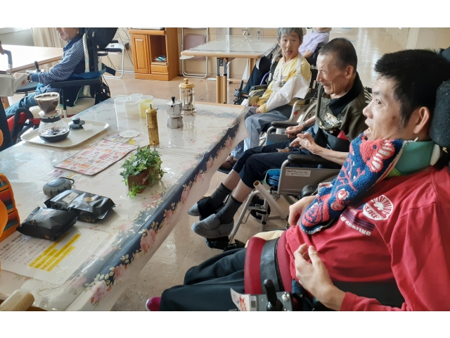日中活動の一環としてコーヒー会を開催!皆さんの前で豆を挽いてハンドドリップで入れました。フロアには珈琲の良い香りが充満し、皆さん楽しそうでした(#^.^#)