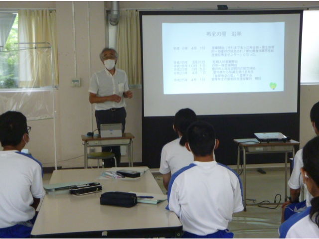 例年は当施設に見学や交流会、希全祭のボランティア、クリスマスソング等の慰問に来ていただきますが、コロナ禍により施設見学ができないため、今回は希全の里から出前講座を行いました。