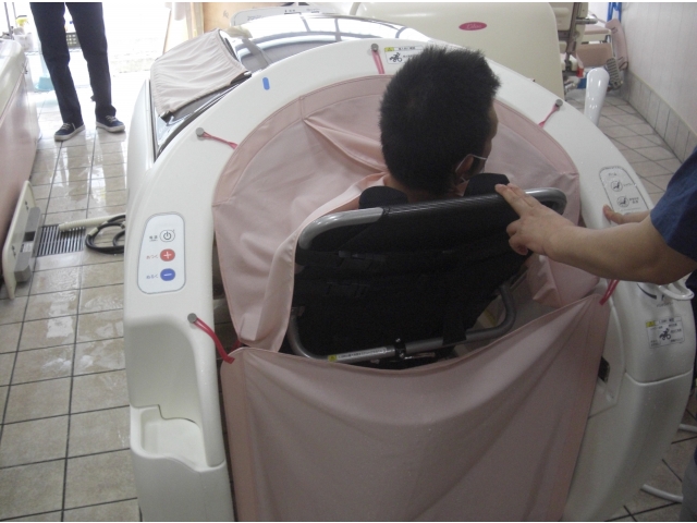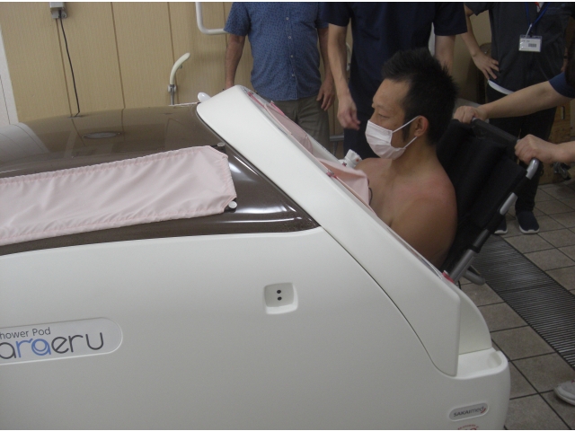 先日、酒井医療株式会社様にお越しいただき、最新の座位入浴「アラエル」を体験しました。