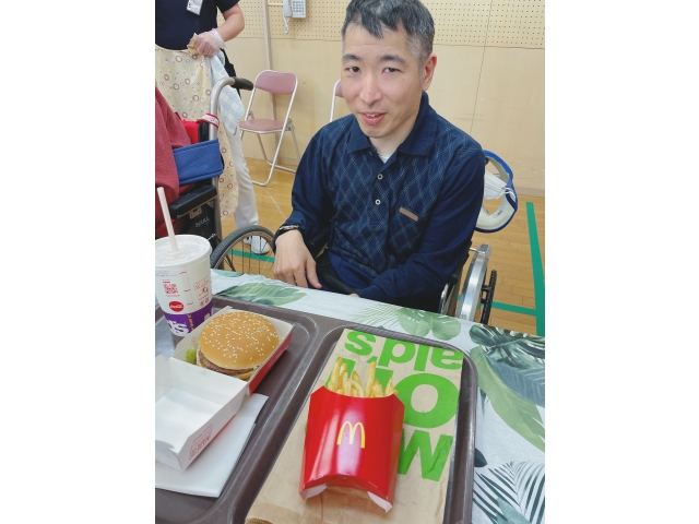 事前に皆様に食べたい物を聞いて、職員が買ってきました。ハンバーガー、鰻丼、お刺身etc