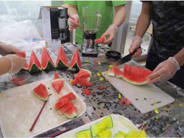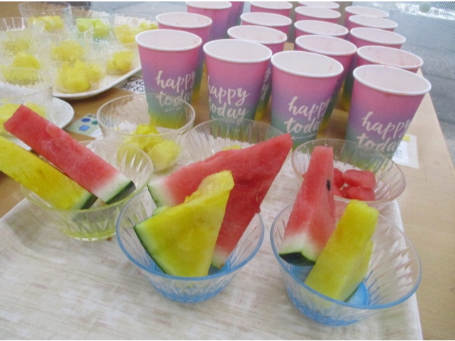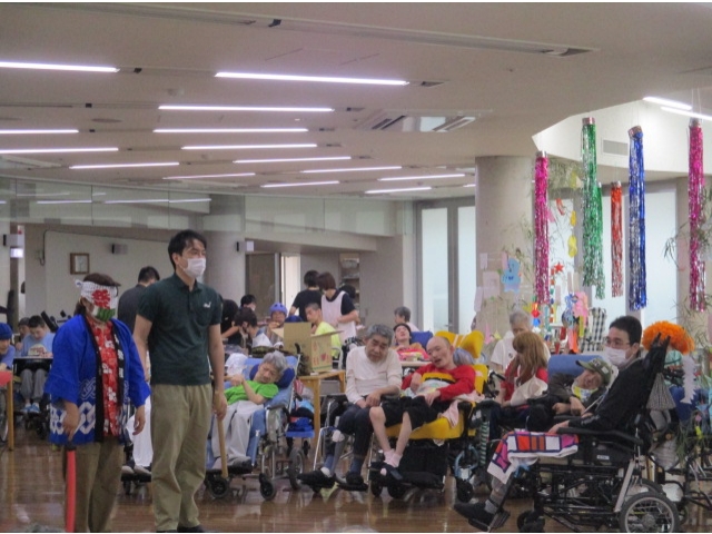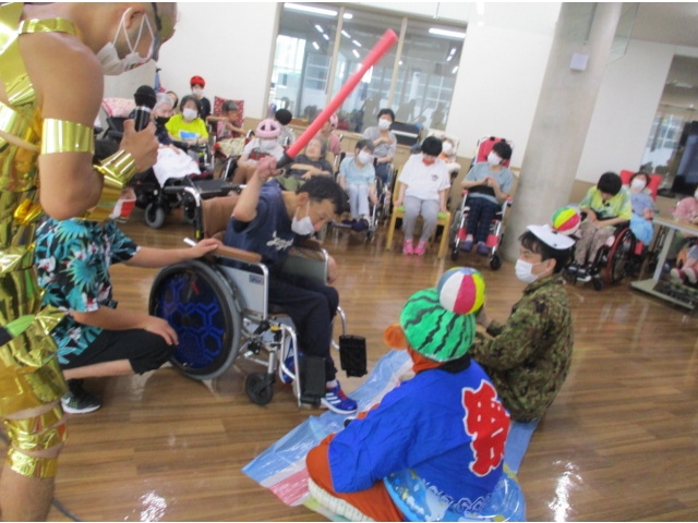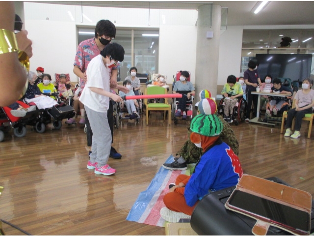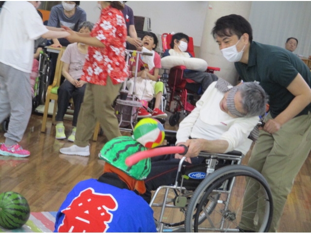 7月7日に七夕会を開催し、スイカ割り🍉を行いました。スイカに見立てた紙風船をスポンジの棒で思う存分割っていただきました。中には紙風船ではなくあえて?職員を狙う人も……⁉