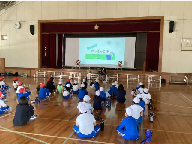 今回の体験教室では、ボッチャと障がい者施設のことについて説明させていただきました。桜町小学校の皆様から「知ってます!」、「見たことがあります!」との声が多くあり、とても驚きました。