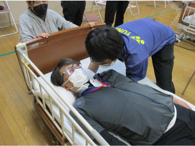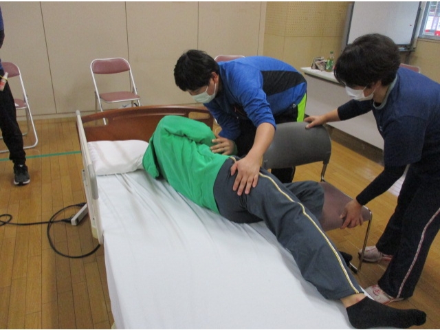 - 頭と肩の下に手を入れベッド奥へと→