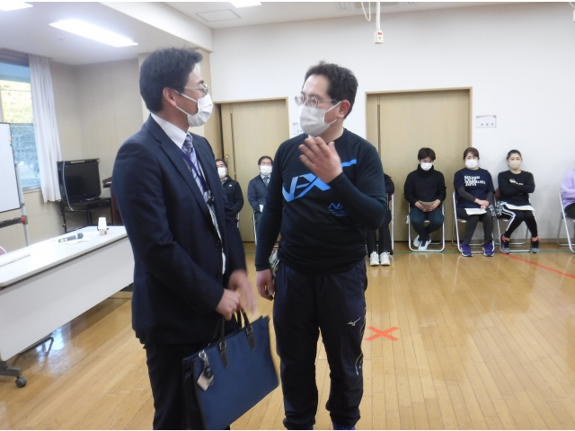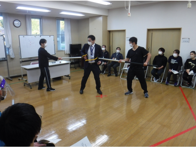 基本知識を学んだ後、実際に不審者が施設に来た場面を想定して、演習を行いました。