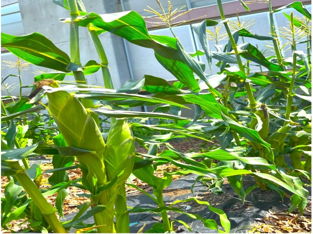 みんなの背丈くらいに成長した草丈に大きなとうもろこし🌽が実っています。