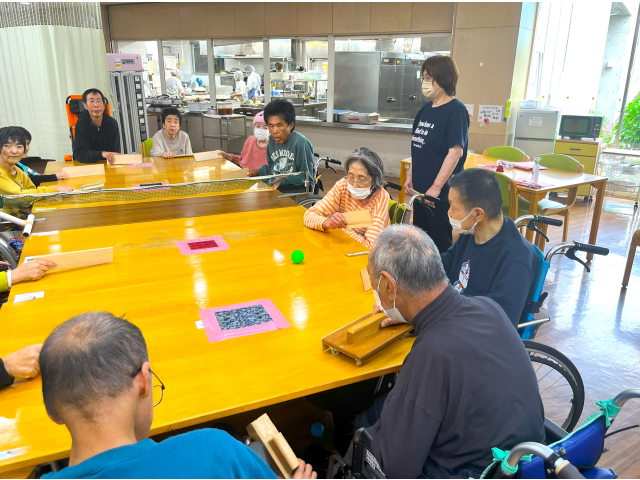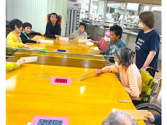 第二生活介護(東棟)では、レクリエーション活動として月に一度ゴロ卓球を行っています。オリジナルのラケット(木の板やT字の棒)を使って白熱した試合を繰り広げています!!楽しみながら、腕や体を伸ばす動作の促し、反射神経、チームの協調性等を向上させる効果も期待できます☆
