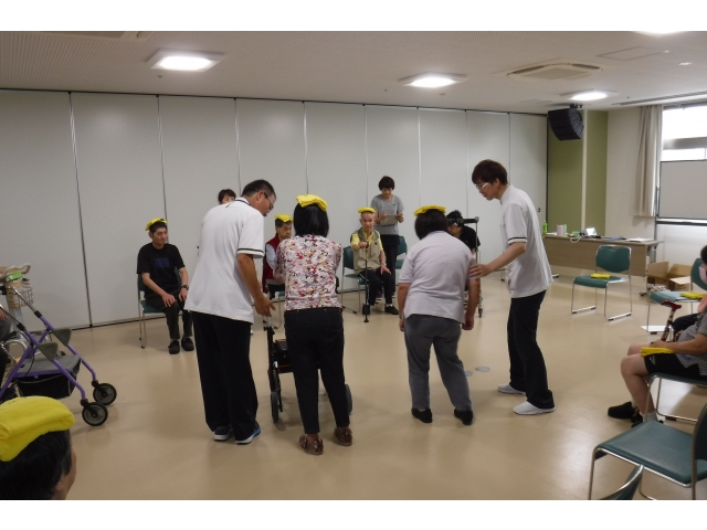 愛知県済生会リハビリテーション病院の理学療法士の皆様が、利用者様対象の転倒予防体操のレクチャーに来寮されました。利用者様のADL低下の防止と健康増進のために、このようなレクリエーションを行っています。