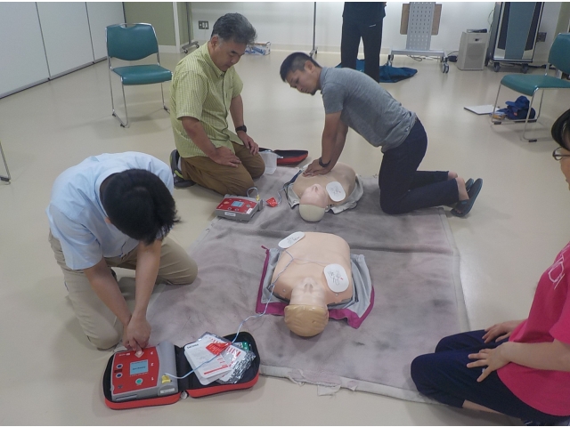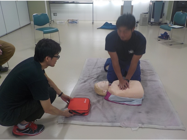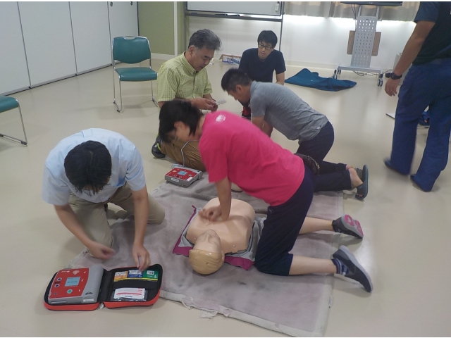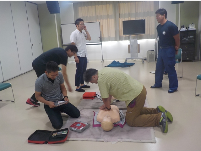 平成30年7月31日に知多中部広域事務所組合消防本部 半田消防署成岩出張所 渡邊氏に来寮していただき、緊急時の一時救命処置として、胸部圧迫とAEDの使用方法について講習を受けました。 救急要請から救急車到着までに全国平均で8分以上かかるそうです。救命率を向上させるためにも救急車到着までの救命処置が 命をつなぐ ためにはとても大切なことだと学びました。