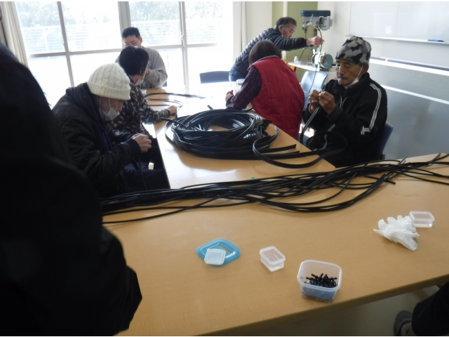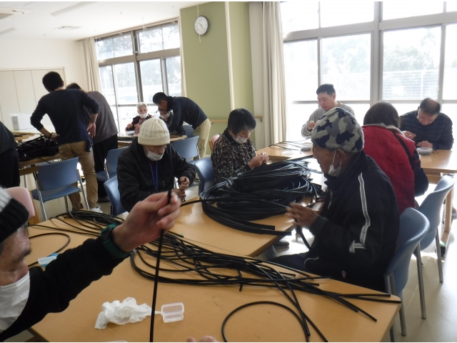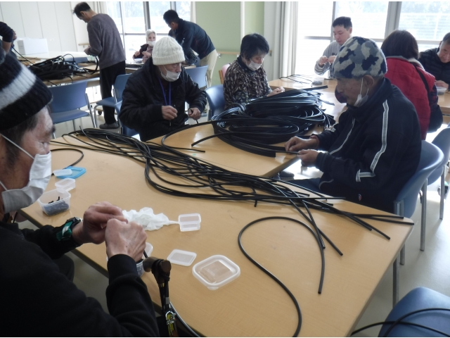 利用者様の自立支援の一環として、自動車のウォッシャーホースの部品取り付け作業を行っています。出来上がった製品は利用者様の工賃として配当され、利用者様の就労意識の向上を図っています。