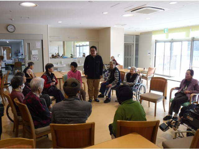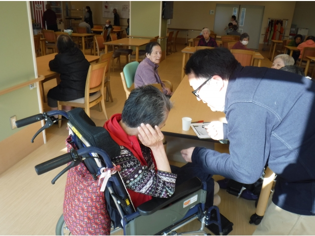 最初に摂食・嚥下に関して何かしらの課題のある利用者様に対して職員と一緒に嚥下訓練を行いました。