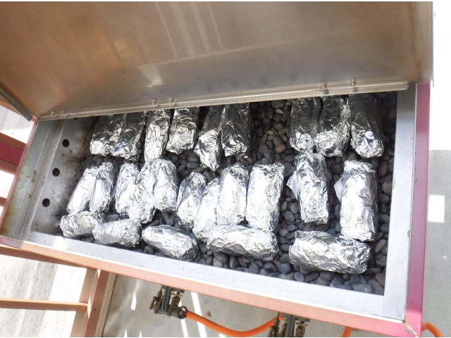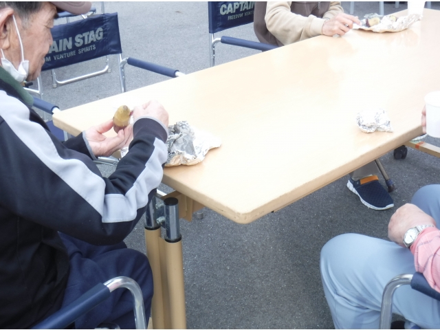 午後は車いすを使った障害物リレー競争を行い、おやつに屋外で作った秋の味覚焼き芋をいただきました。