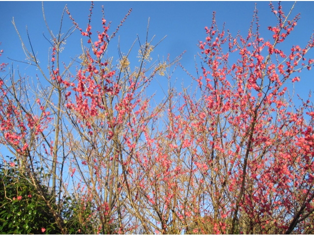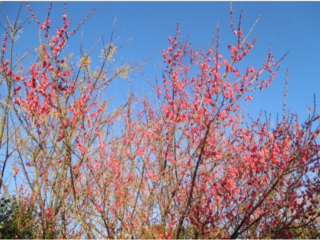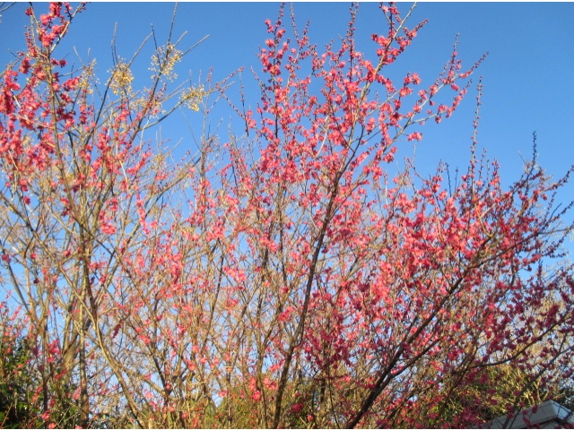 新生寮の門の前には、この季節きれいな紅梅が咲き乱れます。