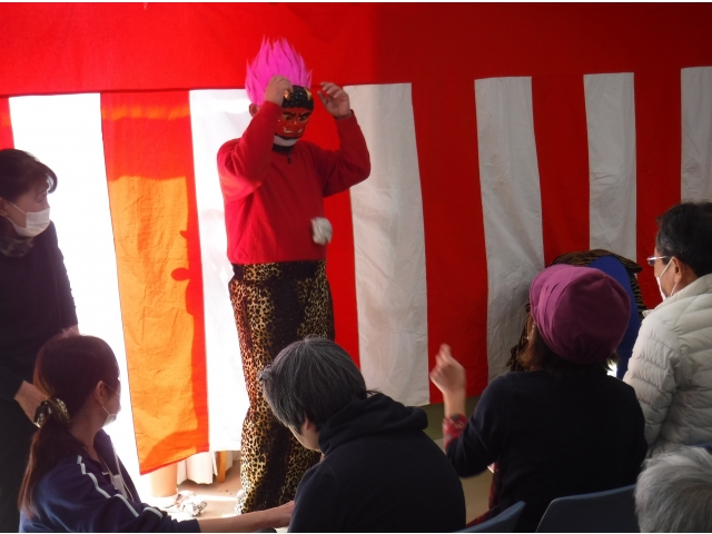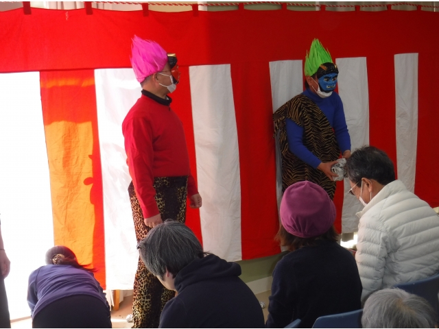 令和2年2月3日に節分会が開催されました。年男、年女の利用者の皆様のご挨拶の後、赤鬼さん青鬼さんが登場。豆に見立てた丸めた古新聞を赤鬼さん青鬼さんに投げて、厄よけを行いました。