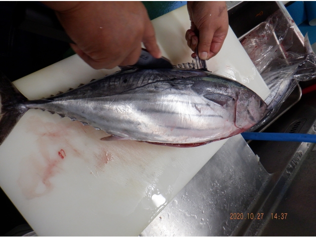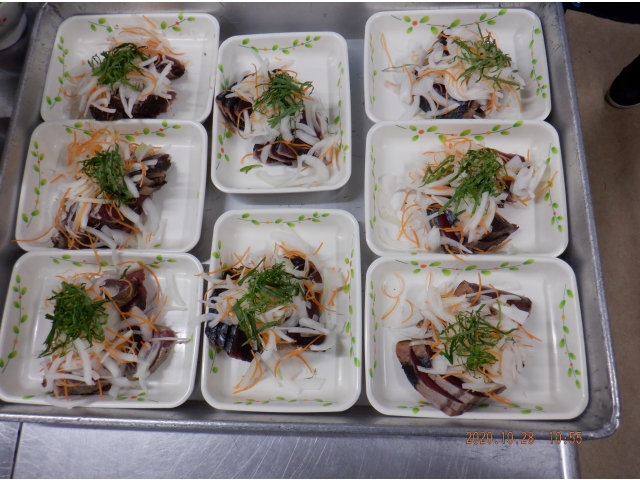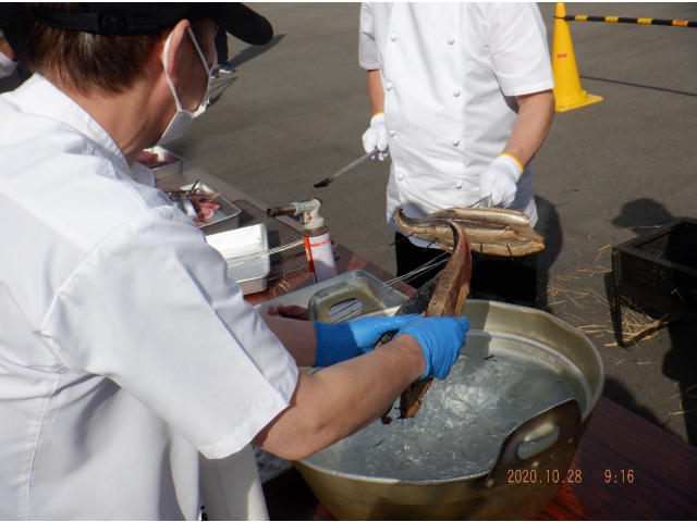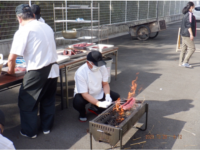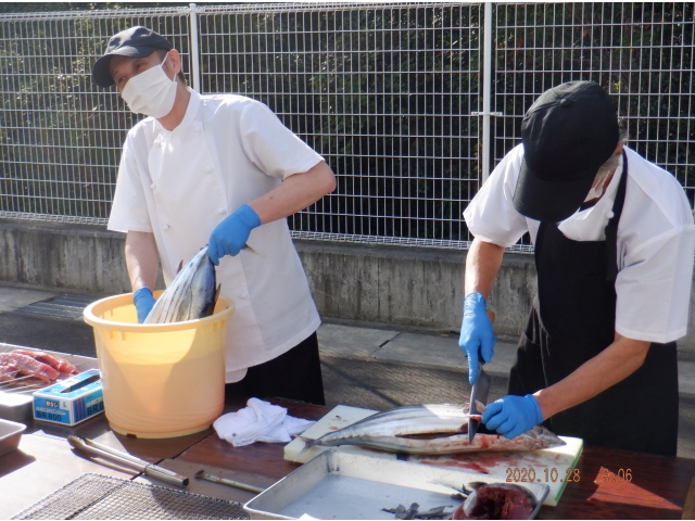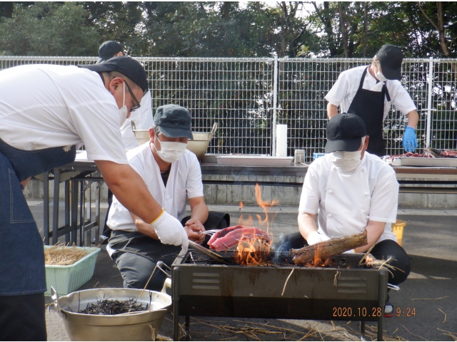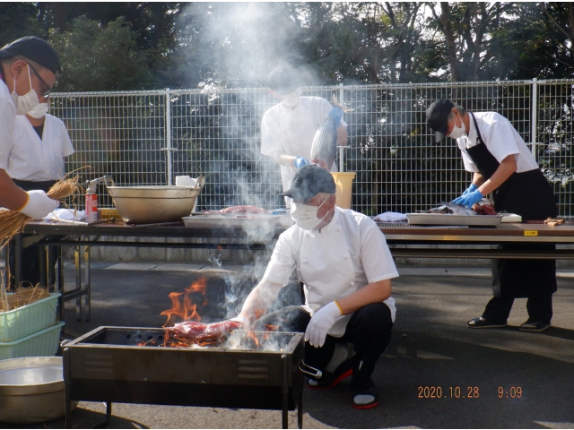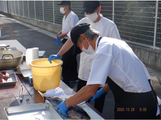 令和2年10月28日さわやかな秋晴の中、多くのギャラリーに囲まれながら、新生寮初のカツオのわら焼きを行いました。調理師により3kg超のカツオが手際よくさばかれ、次々とわら焼きにされました。
