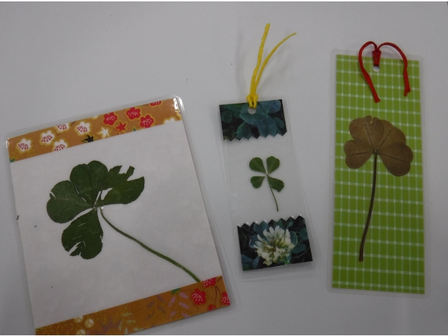 ☘ 利用者が見つけた四つ葉のクローバーでしおりを作成しました☘