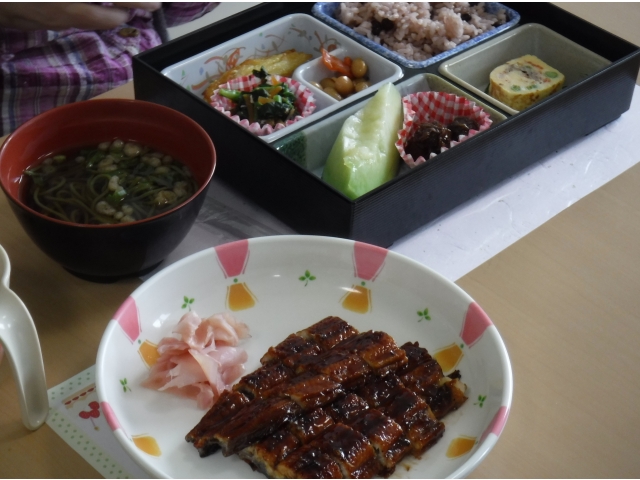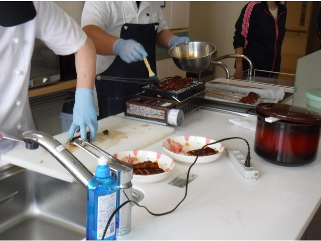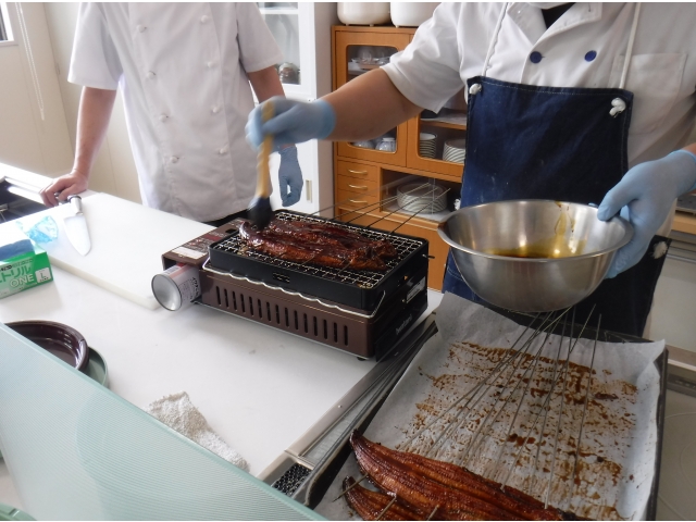 令和3年5月13日に5月に誕生日を迎えられた利用者の皆様の誕生会を行いました。今年度から誕生会のメニューに「ウナギの蒲焼」が加わり、目の前で調理師が香ばしい香りをたてながら、ウナギを焼きます。