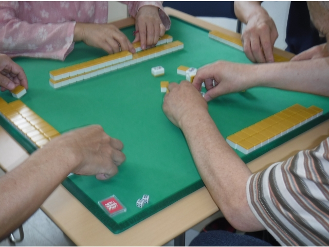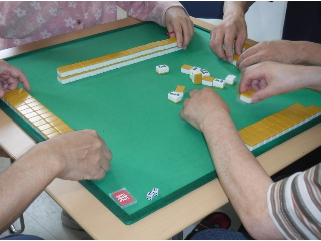 毎週土曜日には、新生寮の利用者の皆様で麻雀を楽しまれています。(もちろん健康麻雀です。)利用者の皆様のコミュニケーションや脳の活性化にも、麻雀は大変役立っているそうです。