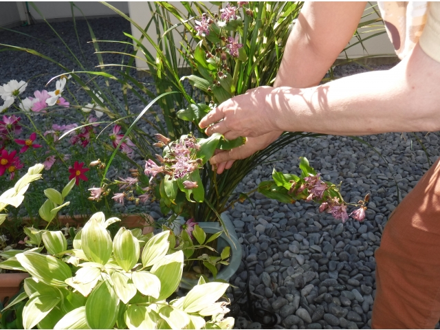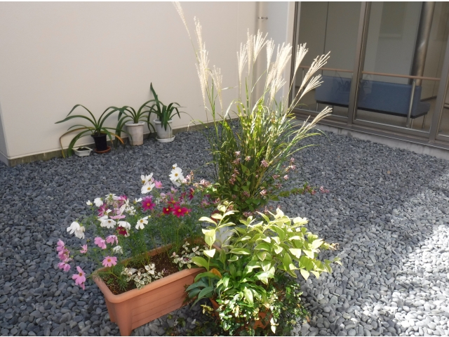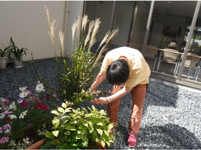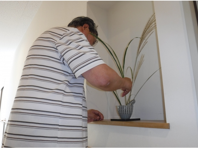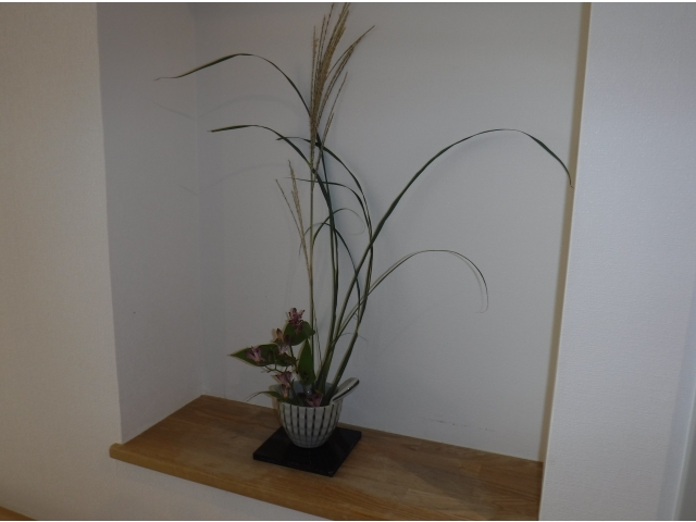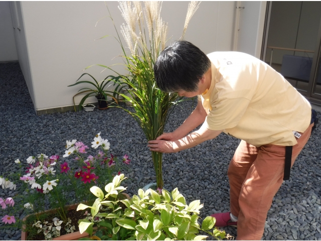 本日の花材は鷹羽すすきとホトトギスです。花器は金魚鉢を使用しました。上手く活けることが出来ました。あとはプランターとのレイアウトもみんなの声掛けで決まりました。2階の飾り棚も活けてくれました。秋ですねー。