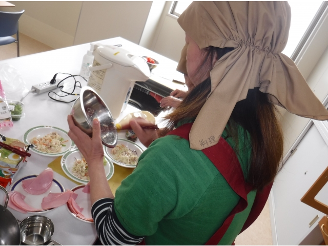 10月25日に、料理クラブを行いました。メニューはラーメン、ツナサラダ、果物(柿)。 袋ラーメンはあの有名な「〇〇〇〇いちばん」。塩ラーメンか味噌ラーメンを選んでいただき、各自で作りました。温泉卵、ハム、ネギをトッピング。「おいしい!」と評判でした。