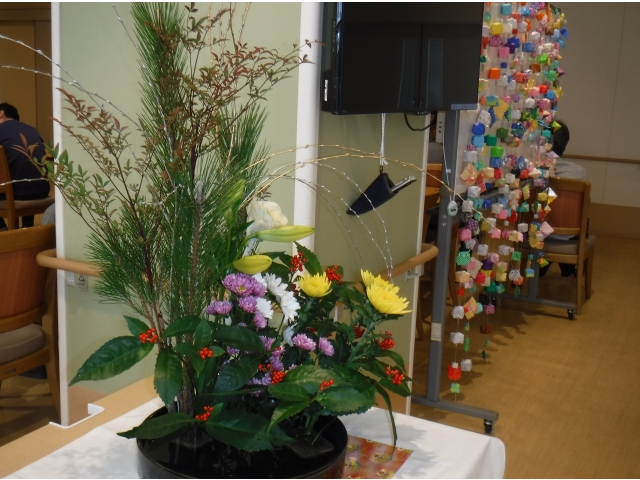 1階食堂で初釜が行われました。有志の利用者様と職員で協力し、お茶点て、お運びを行いました。会場には新春らしい飾りや、季節の花が飾られてあり、ゆったりと落ち着いた中で、お抹茶と和菓子の練り切りを召し上がっていただき、飲み終えた利用者様からは「美味しかったね」「良かったね」と笑顔がこぼれ、充実した時を過ごされました。