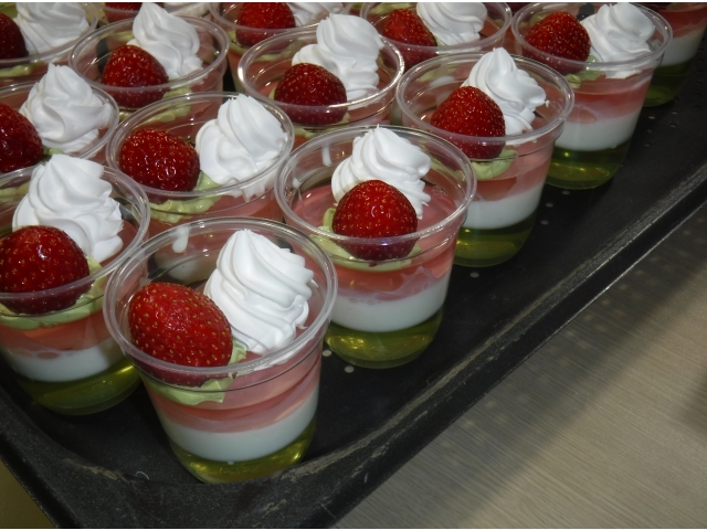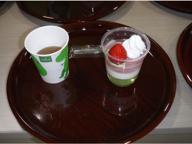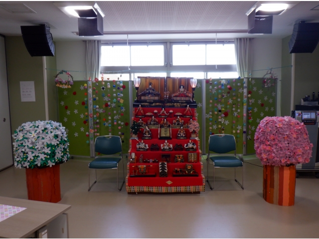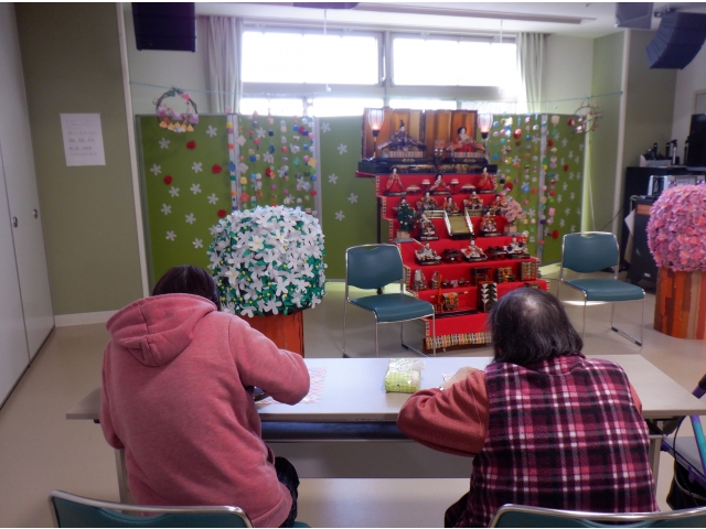 ひな祭りの音楽が掛かる中、ひな壇を見ながら厨房手作りの三食ゼリーを頂きました。廊下まで甘い美味しそうな香りがして「早く食べたーい!」と順番を待っていらっしゃいました。ゼリーを頂いてから、ひな壇横で写真撮影をしました。みなさん童心に帰りパチリ。楽しいひとときになりました。