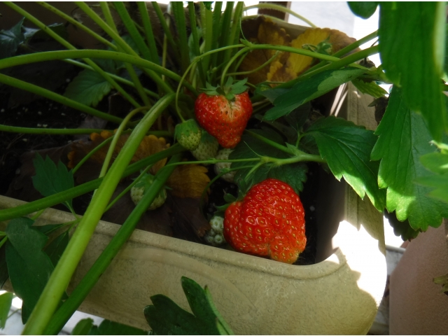 新生寮のベランダでみんなが協力して育てているイチゴが、赤くなりました。まだ花が咲いているものや、実が白いものも多いですが、これから赤くなり、甘いイチゴの収穫が楽しみです。